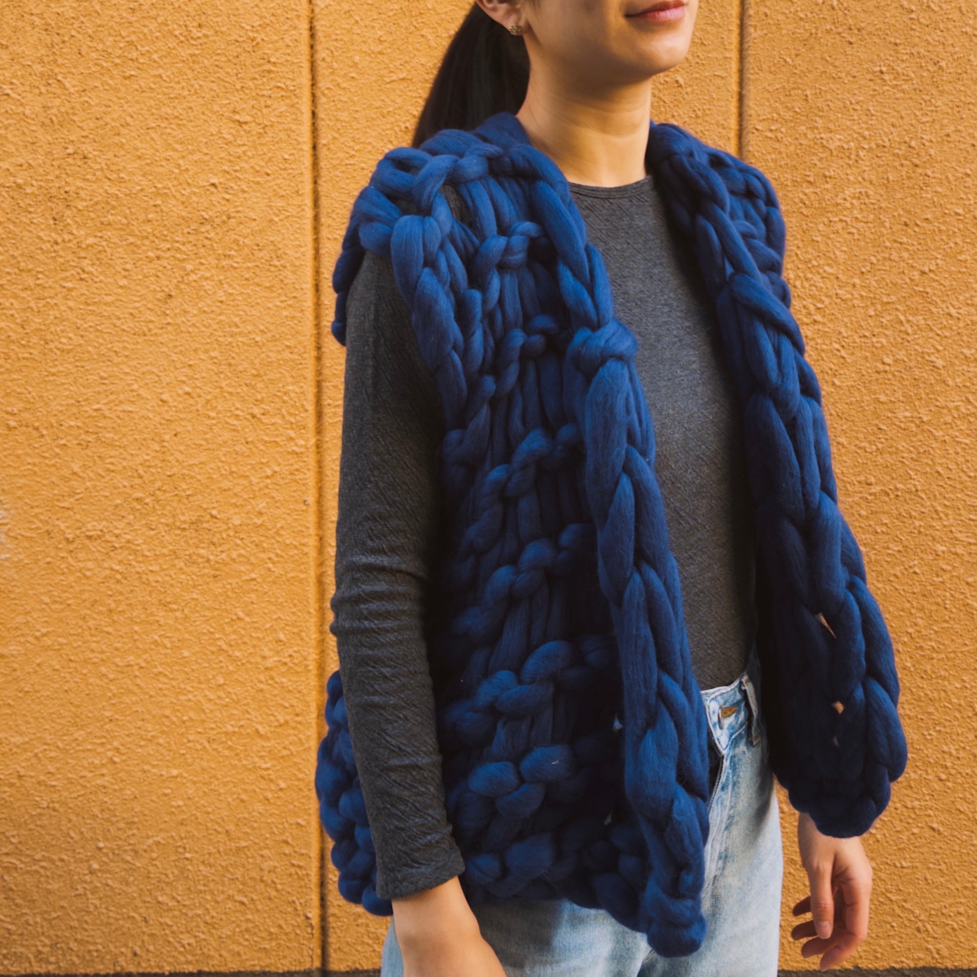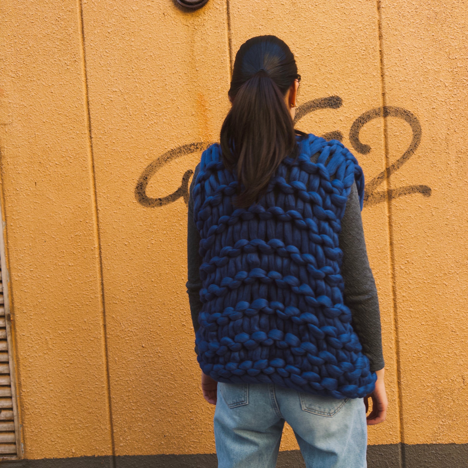 厳選された上質なメリノウールを贅沢に使用し、極太の糸で丁寧に編み上げたニットベスト。手編みならではの立体感と存在感がありながら、驚くほど柔らかく、肌にやさしく馴染みます。