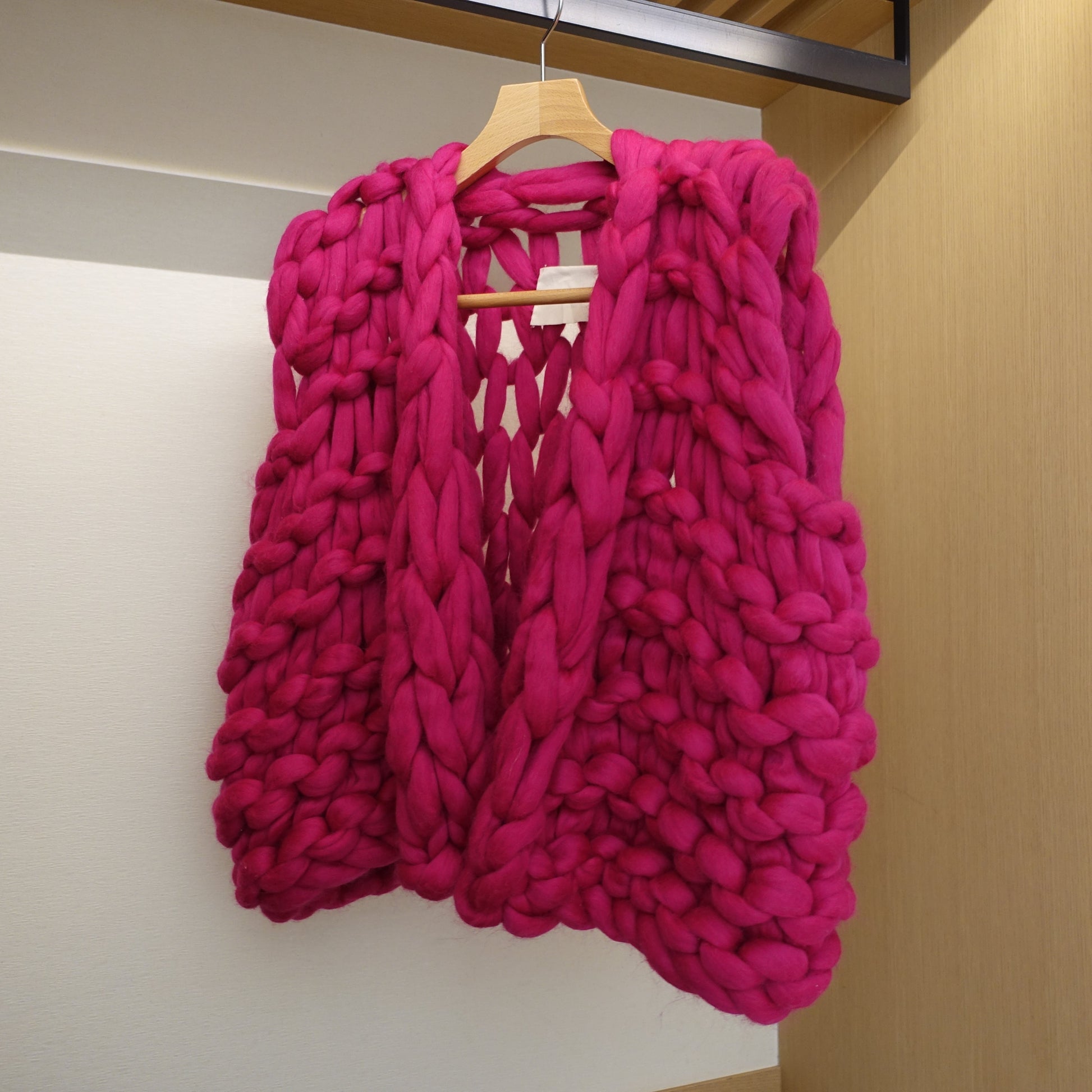厳選された上質なメリノウールを贅沢に使用し、極太の糸で丁寧に編み上げたニットベスト。手編みならではの立体感と存在感がありながら、驚くほど柔らかく、肌にやさしく馴染みます。