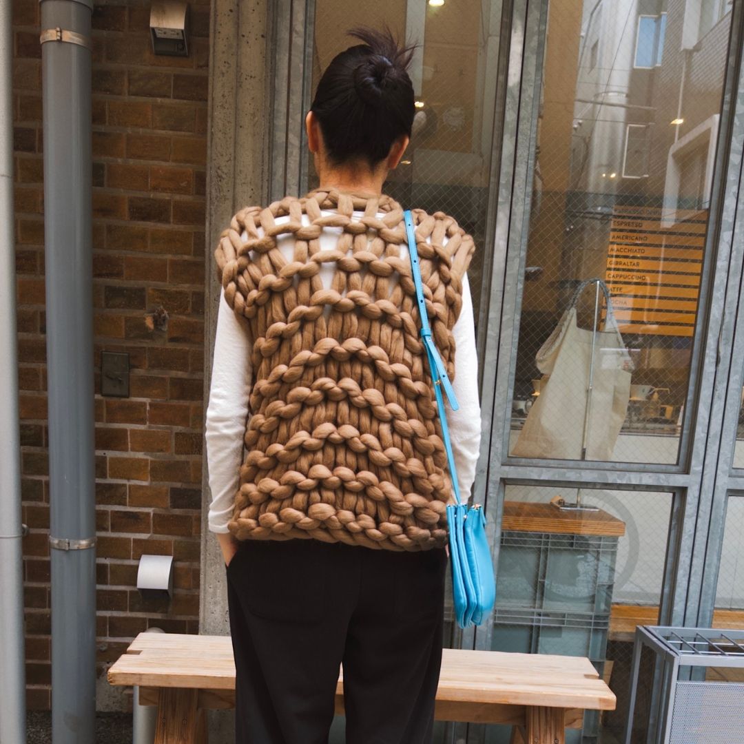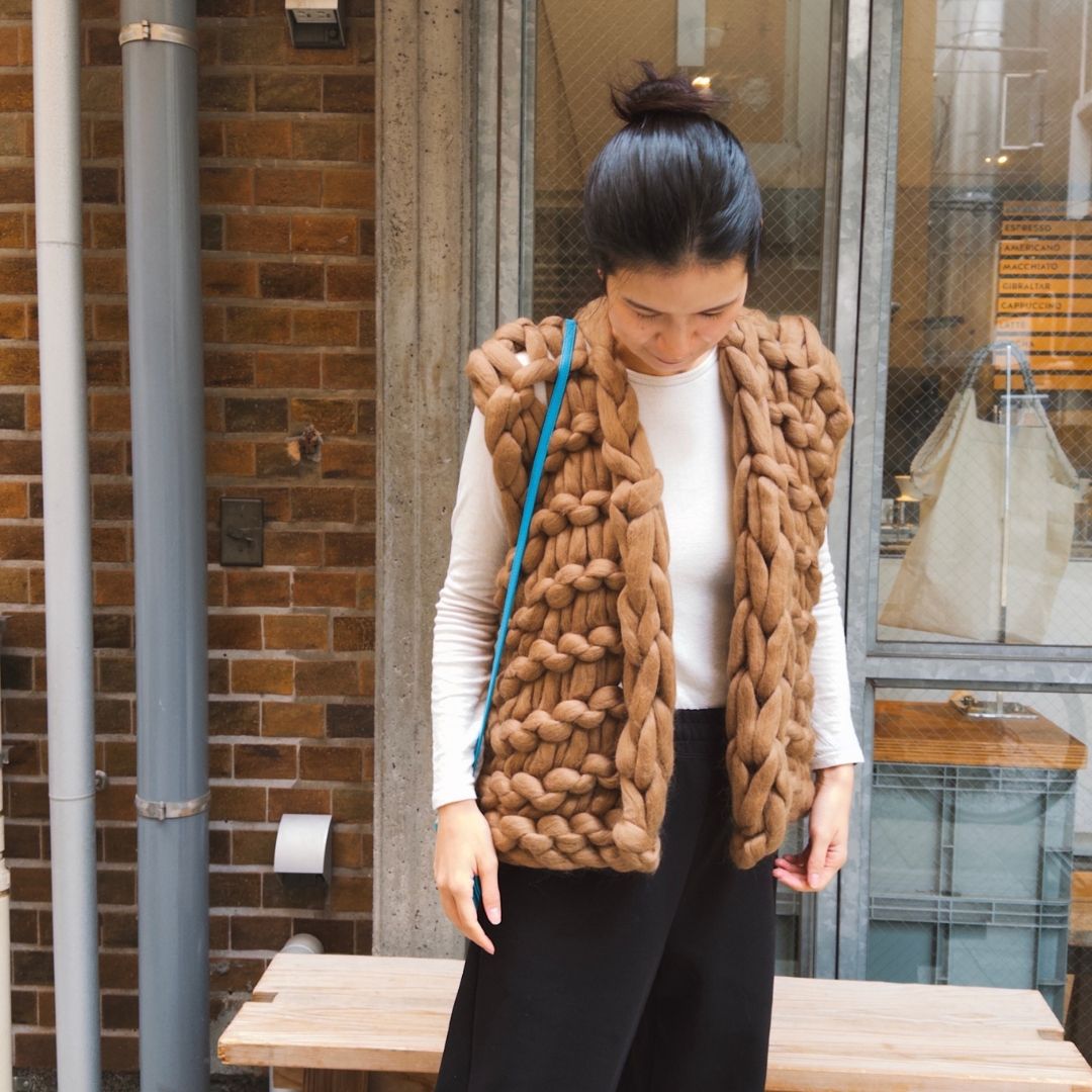厳選された上質なメリノウールを贅沢に使用し、極太の糸で丁寧に編み上げたニットベスト。手編みならではの立体感と存在感がありながら、驚くほど柔らかく、肌にやさしく馴染みます。