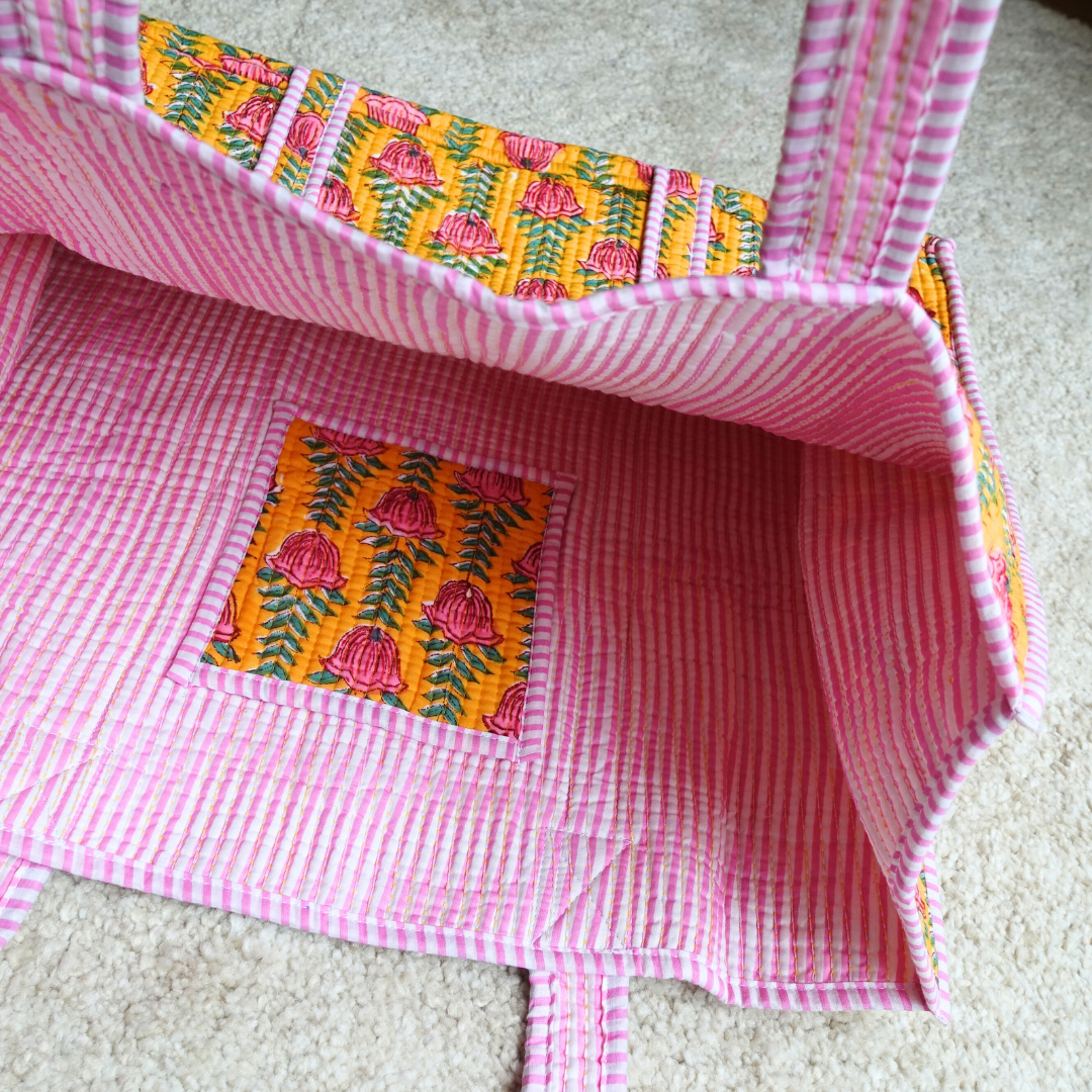 ブロックプリントの華やかな柄と、ふっくらキルト素材がポイント。軽いのに丈夫だから、毎日気軽に使えます。