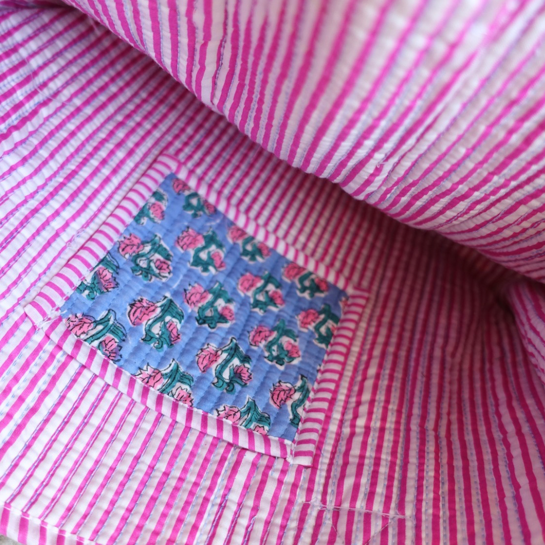 ブロックプリントのカラフルな柄と、ふっくらしたキルト素材が特徴。軽くて丈夫だから、毎日気軽に使えます。