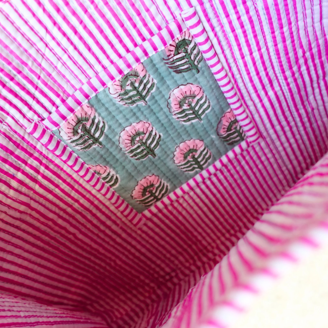 ブロックプリントのカラフルな柄と、ふっくらしたキルト素材が特徴。軽くて丈夫だから、毎日気軽に使えます。