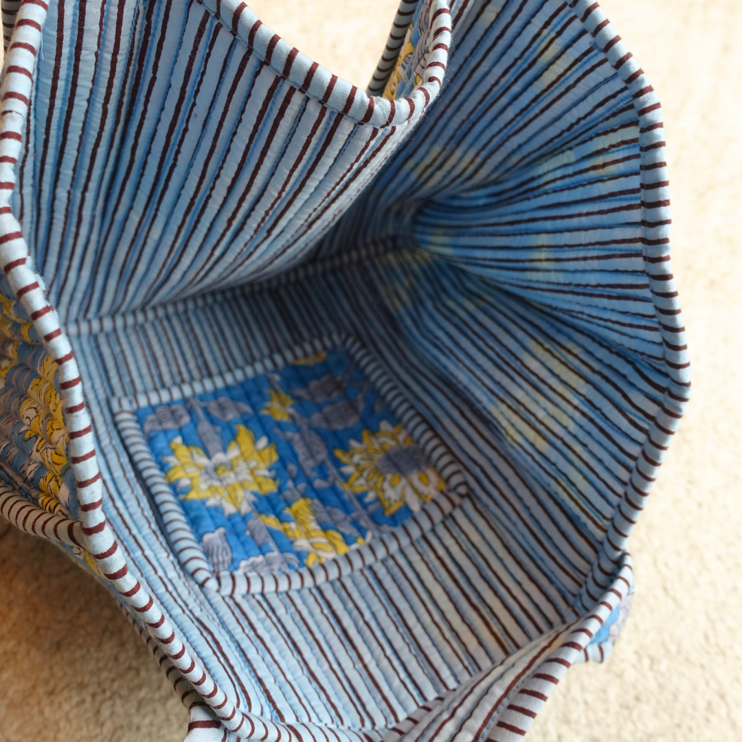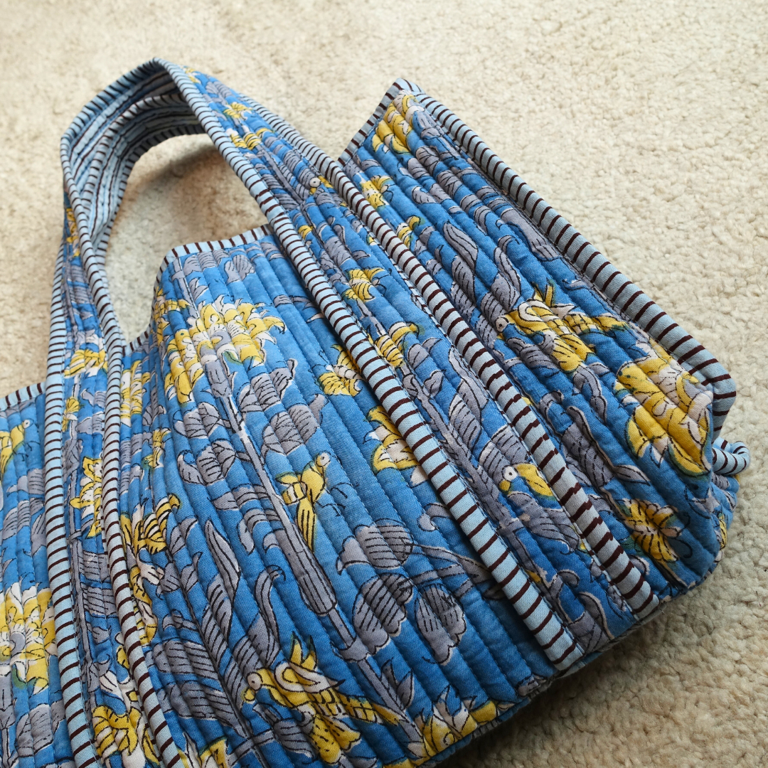 ブロックプリントのカラフルな柄と、ふっくらしたキルト素材が特徴。軽くて丈夫だから、毎日気軽に使えます。