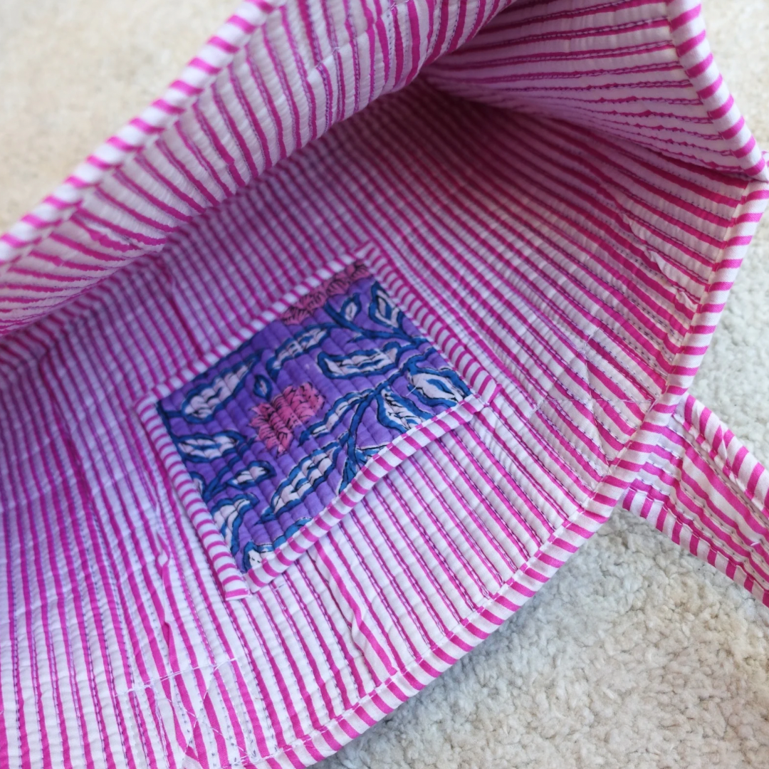 ブロックプリントのカラフルな柄と、ふっくらしたキルト素材が特徴。軽くて丈夫だから、毎日気軽に使えます。
