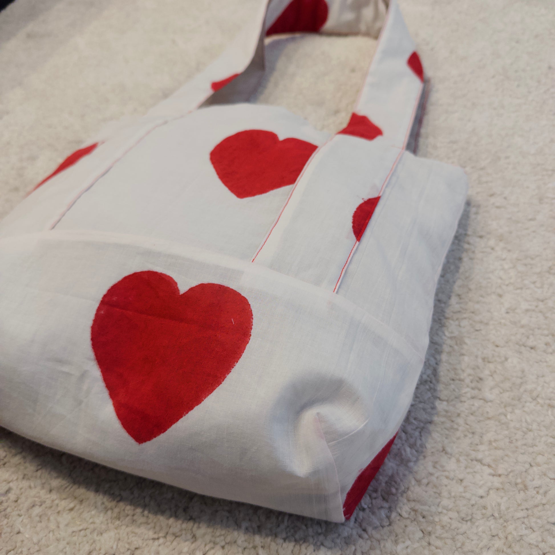 赤のハート柄のブロックプリント生地を使った特別なトートバッグ。